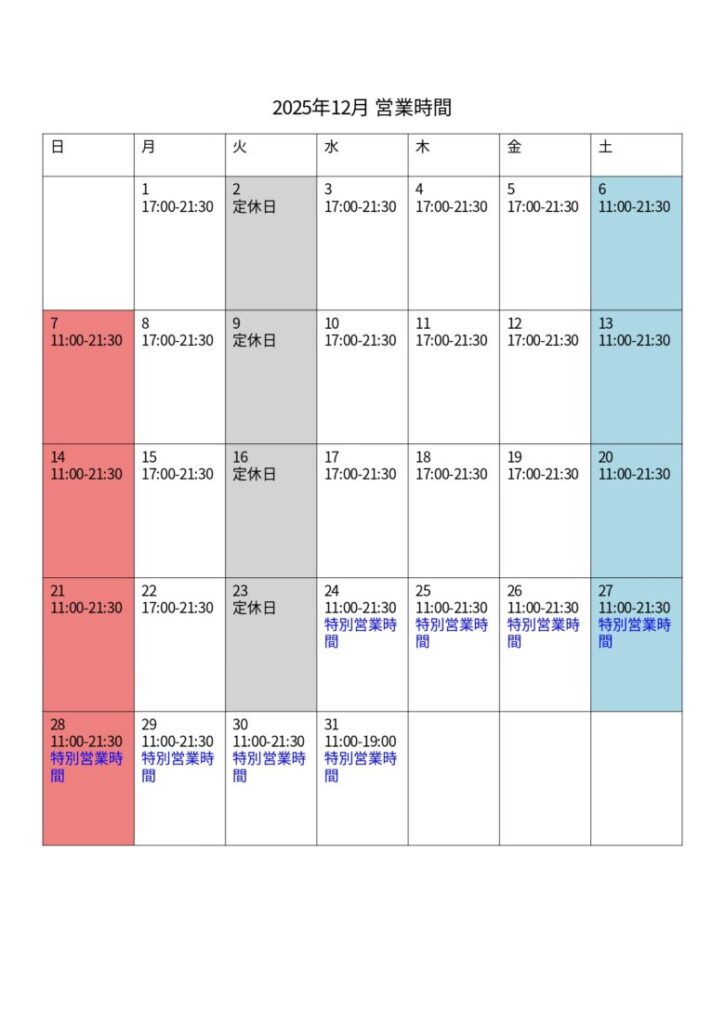 12月より営業時間が正式に変更になります。12月と1月の営業スケジュールは下記をご覧ください。