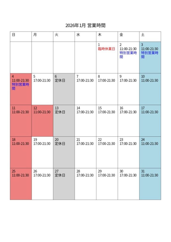 営業時間 :水曜日~日曜日、祝日 AM11:00~PM9:30(オーダーストップPM9:30)